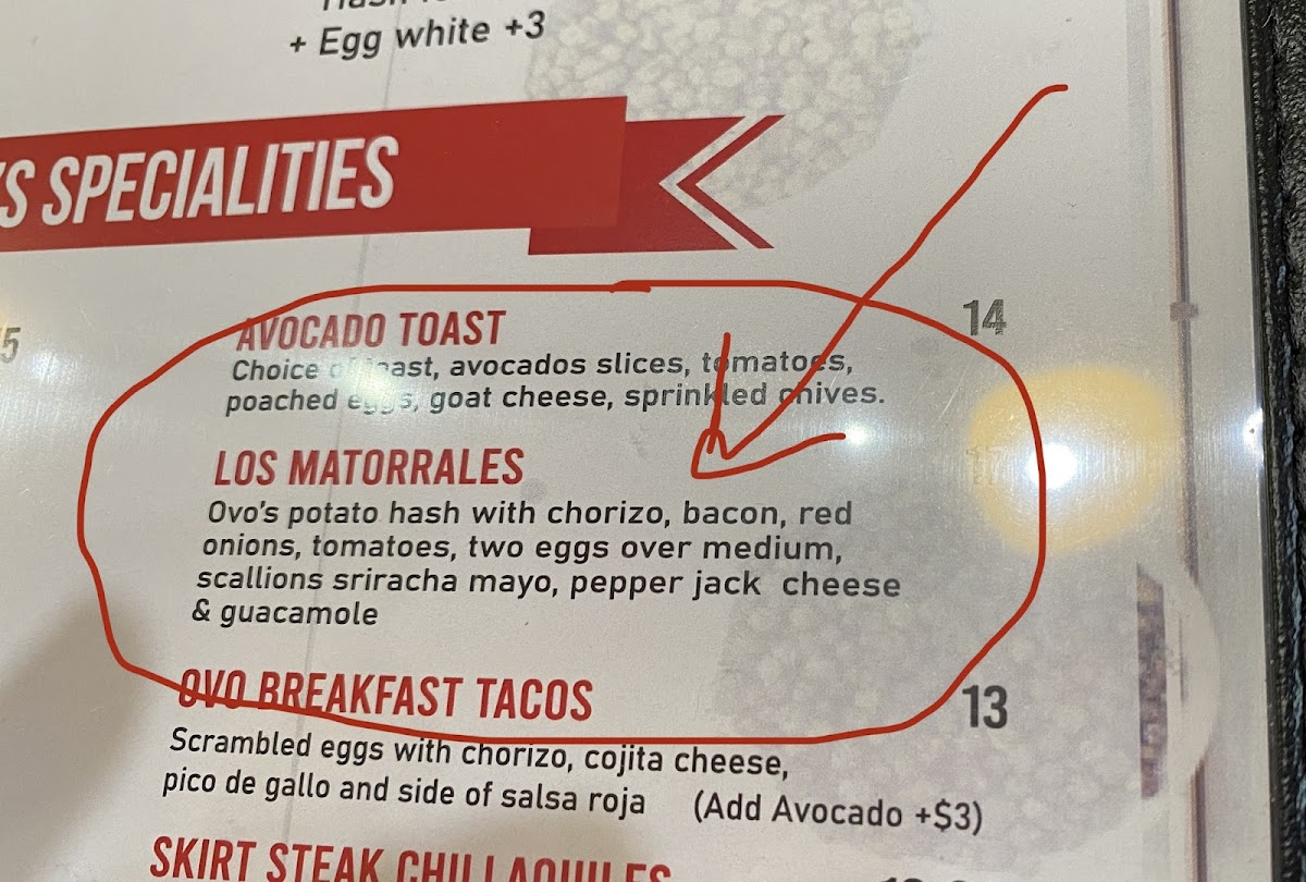 eggs scrambled with chorizo, sprinkled cotija cheese, topped with pico de gallo and sided with salsa roja